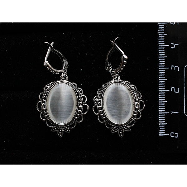Cерьги из кошачьего глаза (синт.) белого, овал 18х13мм, оправа "трилистник", швензы посеребрение