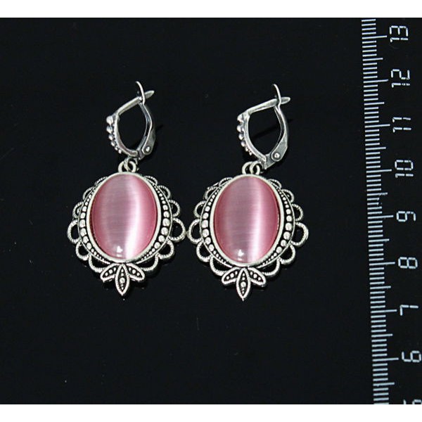 Cерьги из кошачьего глаза (синт.), цвет розовый, овал 18х13мм, "трилистник", швензы посеребрение