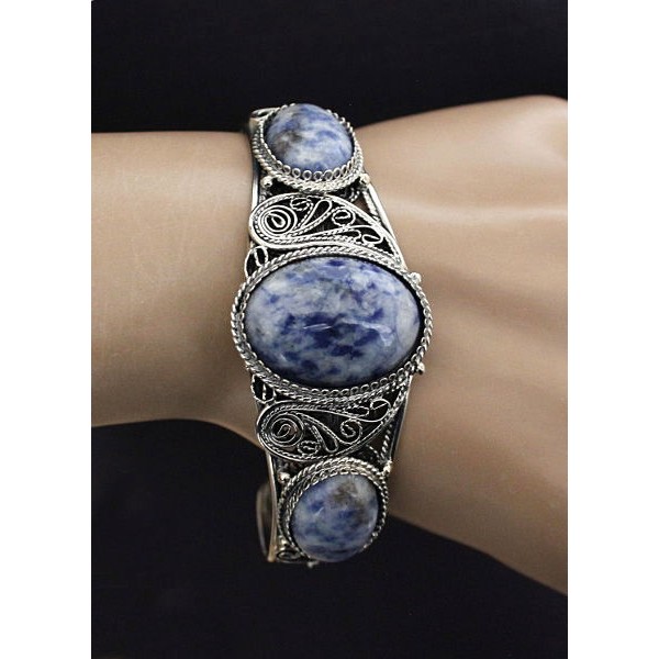 Браслет из лазурита бело-синего, филигрань, ручная работа, камень овал 25х18мм, овал 18х13мм