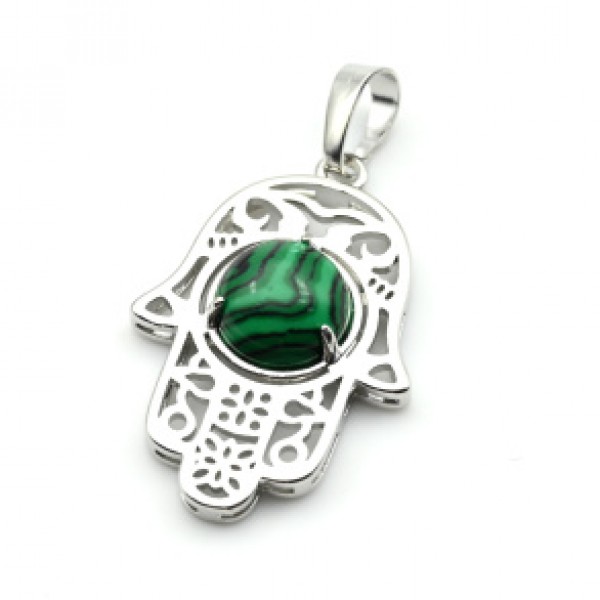 Кулон Хамса 22*30мм с малахитом искусственным в оправе из ювелирного сплава (иск.)