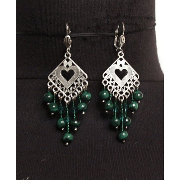 Cерьги из малахита (шарик 6мм), коннектор "сердце в ромбе" + хрусталь