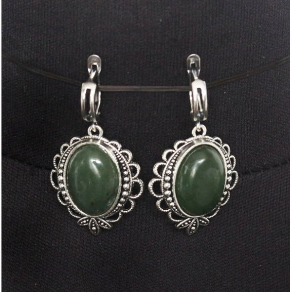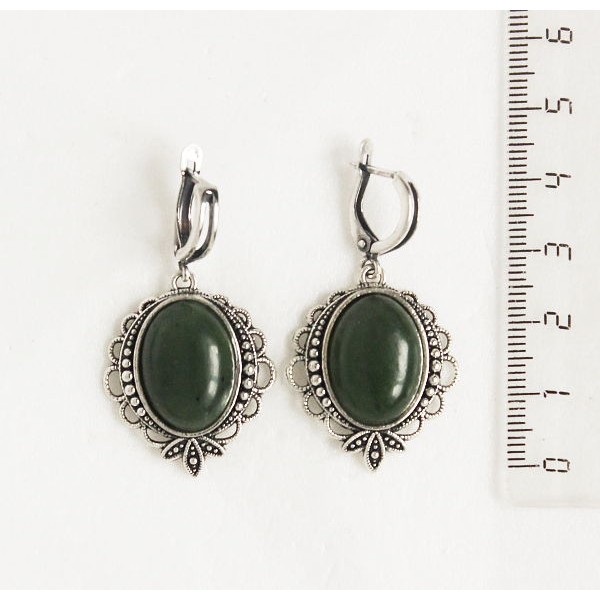 Cерьги из нефрита, овал 18х13мм, оправа "трилистник", швензы посеребрение