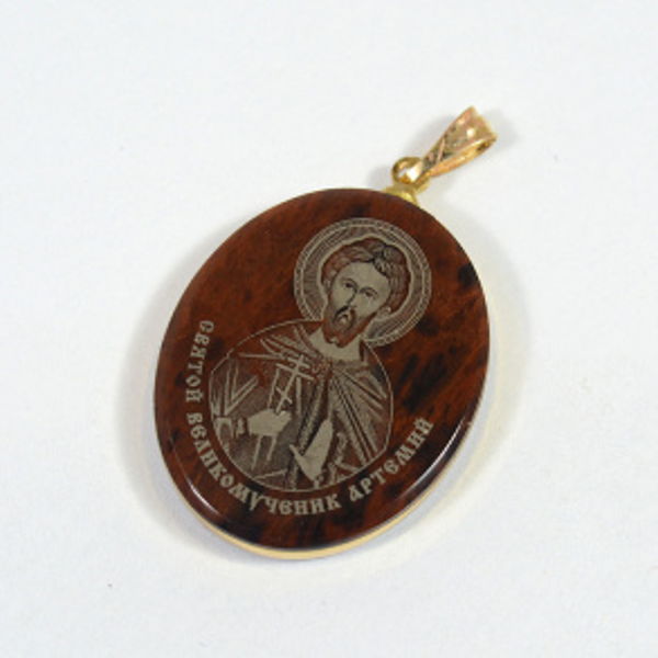 • Кулон из обсидиана овал с окантовкой " Св. Артемий " 20*30мм