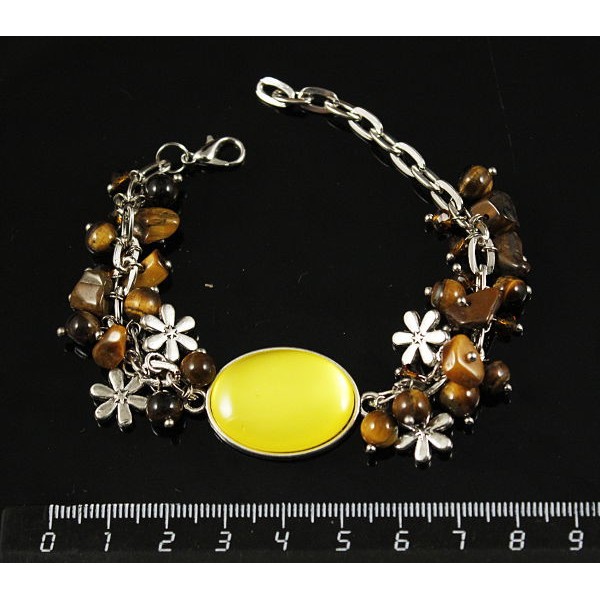 Браслет пластик желтый (эффект опала), + тигровый глаз шарик, овал 25х18мм, на цепочке