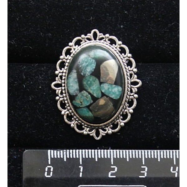 Брошь из амазонита и пирита, мозаика, с ажурным контуром, цвет ант. серебро, овал 25х18мм