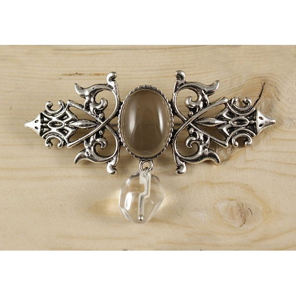 Брошь из раухтопаза "вензель", основа 70х2.4мм, овал 18х13мм, подвеска горный хрусталь