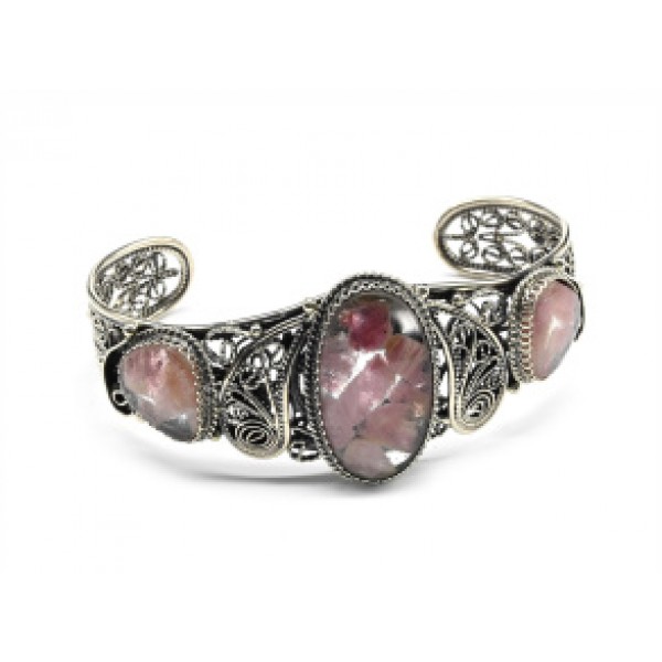 Брошь из турмалина розового (кабошон-мозаика), овал 25х18мм, оправа с узором цвет бронза