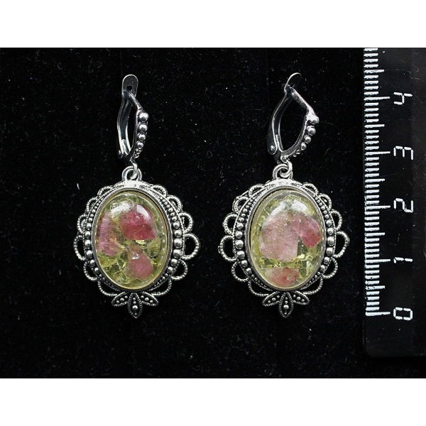 Cерьги из хризолита и турмалина розового (кабошон-мозаика), овал 18х13мм, оправа "трилистник", швензы посеребрение
