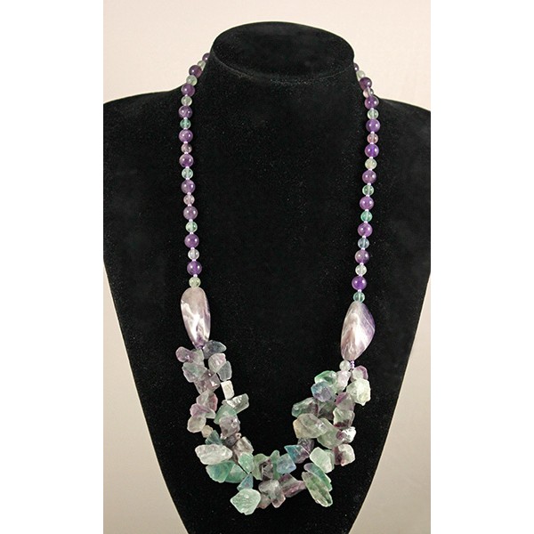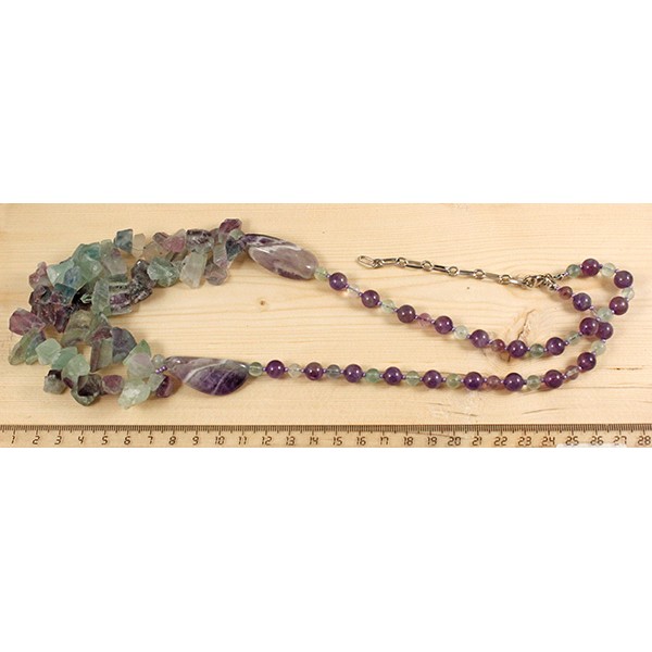 Колье из флюорита и аметиста 60см, колотый 2 нити + бусины 35мм + шарик 6 и 8мм