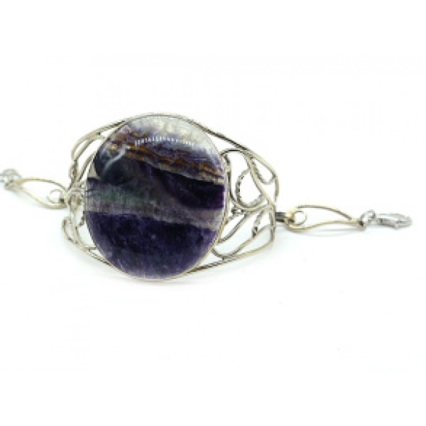 Брошь из флюорита "вензель", основа 70х2.4мм, овал 18х13мм, подвеска аметист
