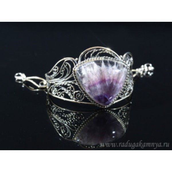 Брошь из флюорита "вензель", основа 70х2.4мм, овал 18х13мм, подвеска аметист
