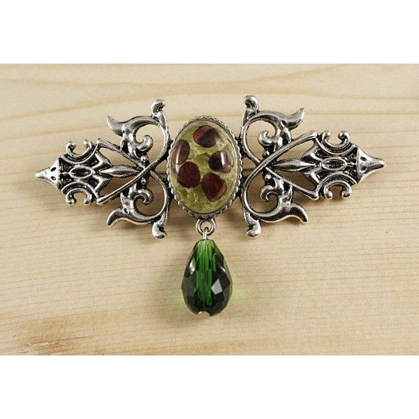 Брошь из хризолита и граната (кабошон-мозаика) "вензель", основа 70х2.4мм, овал 18х13мм, подвеска зеленая