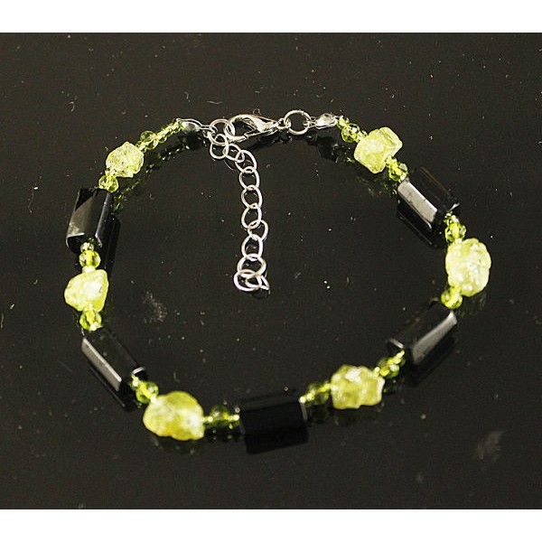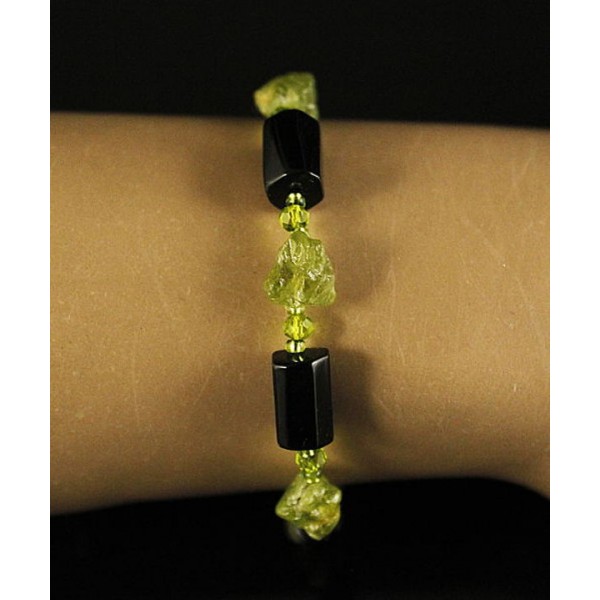 Браслет из гематита (цилиндры) и хризолита необработанного, с хрусталем, на застежке