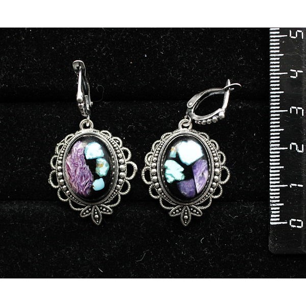 Cерьги из чароита и нат. бирюзы (кабошон-мозаика), овал 18х13мм, оправа "трилистник", швензы посеребрение