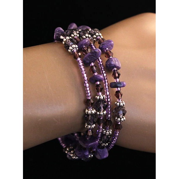 Браслет из чароита на струнке 4 оборота с хрусталем и бисером