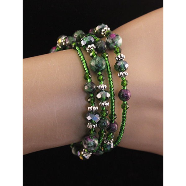 Браслет из цоизита (шарик 8мм) на струнке с хрусталем и бисером