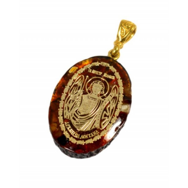 Кулон с янтарем иконка "Архангел Михаил" овал 21*31мм. (иск.)