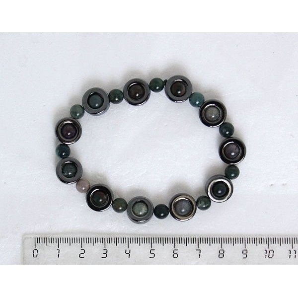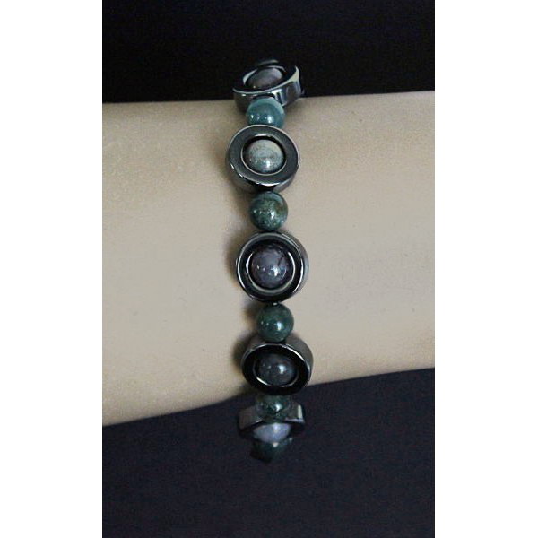 Браслет из яшмы зеленой, шарик в круглой рамке из гематита