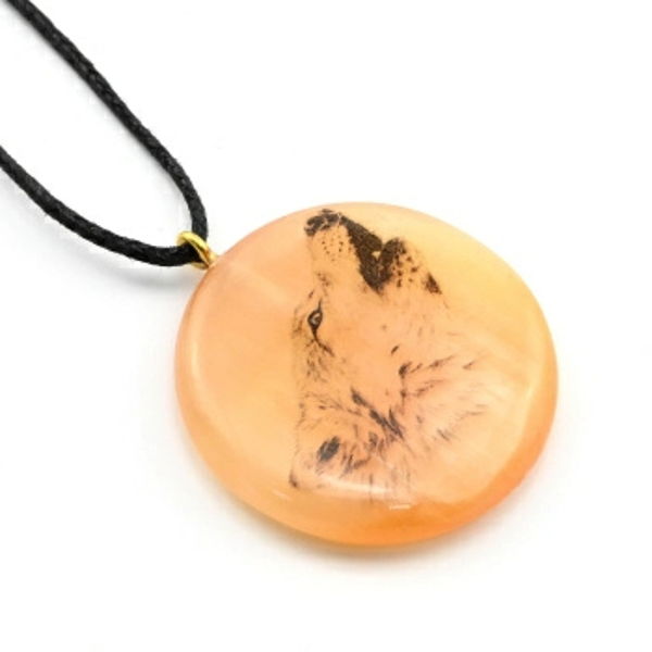 Кулон Волк из селенита круг 40мм на шнурке