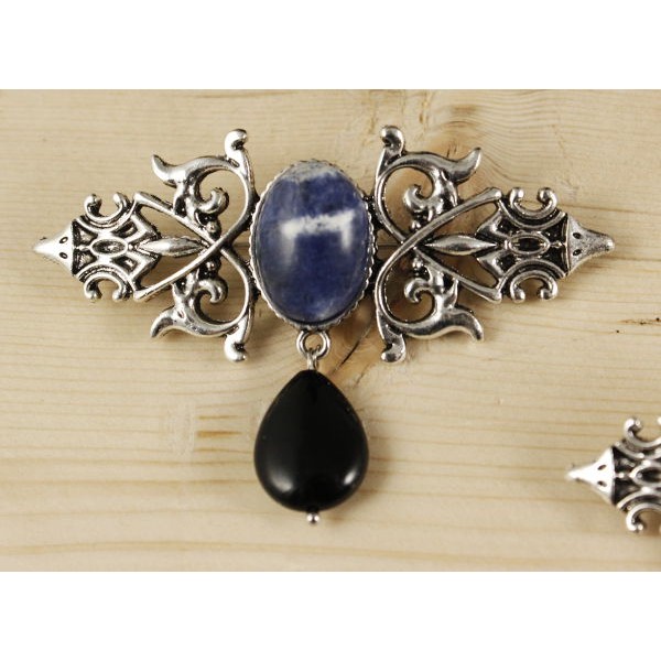 Брошь из содалита "вензель", основа 70х2.4мм, овал 18х13мм, подвеска агат черный