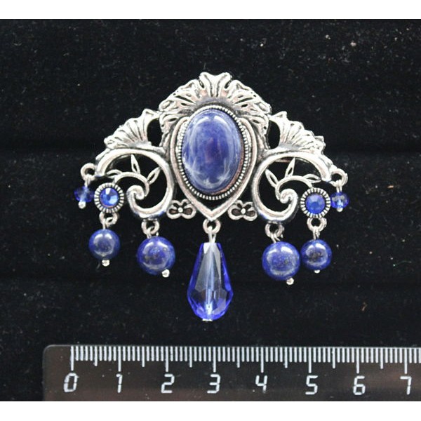 Брошь из содалита "трюмо", овал 18х13мм, со стразами и подвесками из хрусталя и лазурита