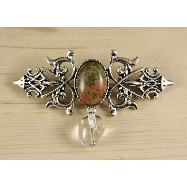 Брошь из унакита "вензель", основа 70х2.4мм, овал 18х13мм, подвеска горный хрусталь