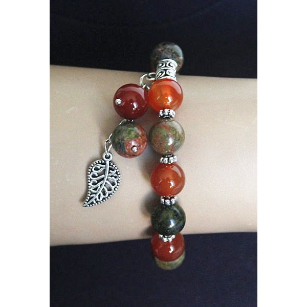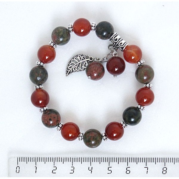 Браслет из сердолика и унакита, шарик 10мм, с подвеской