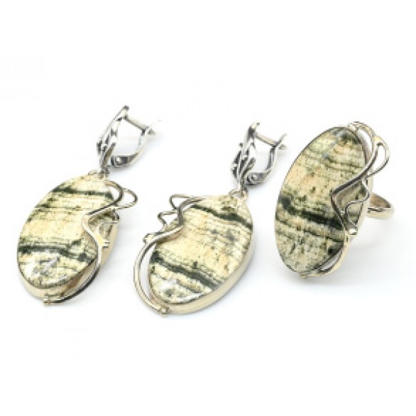 Кольцо и серьги из скарна, овал 33х17 мм, швензы посеребрение р-р 17-19