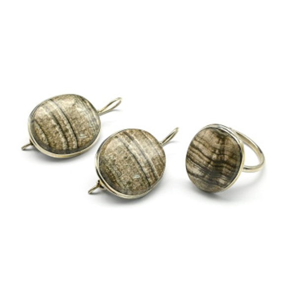 Кольцо и серьги из скарна, овал 30х15 мм, швензы посеребрение р-р 16-18