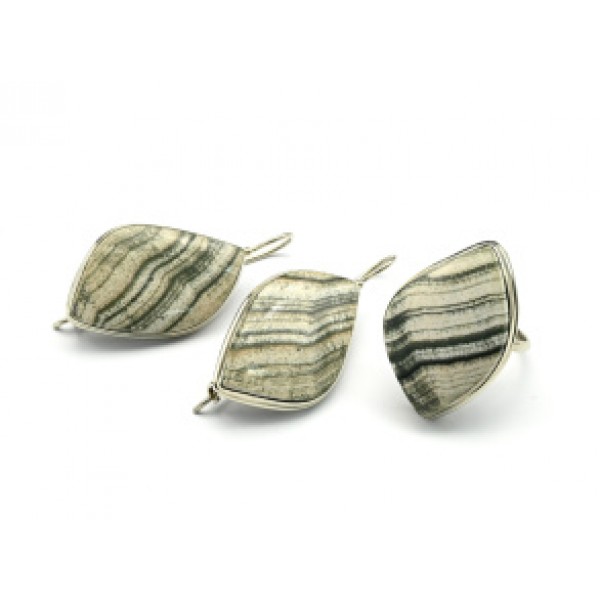 Кольцо и серьги из скарна, овал 33х17 мм, швензы посеребрение р-р 17-19