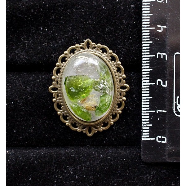 Брошь из волосатика и хромдиопсида (кабошон-мозаика), овал 25х18мм, оправа с узором цвет бронза