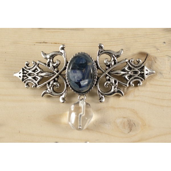 Брошь из кианита (кабошон-мозаика) "вензель", основа 70х2.4мм, овал 18х13мм, подвеска горный хрусталь
