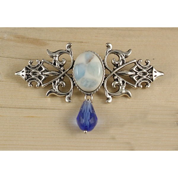 Брошь из ларимара (кабошон-мозаика) "вензель", основа 70х2.4мм, овал 18х13мм, подвеска синяя