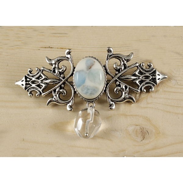 Брошь из ларимара (кабошон-мозаика) "вензель", основа 70х2.4мм, овал 18х13мм, подвеска горный хрусталь