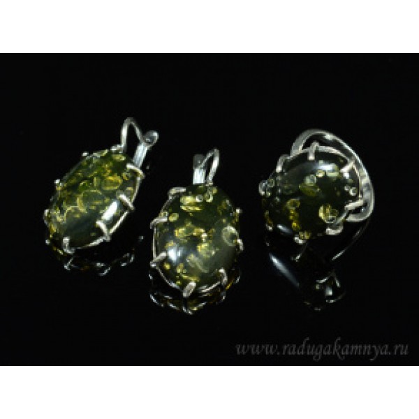 Набор с янтарём кольцо, серьги овал 19*26мм зеленый, 9,4гр. (иск.)