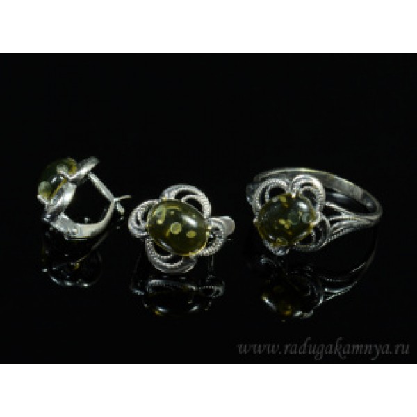 Набор с янтарём кольцо, серьги овал 14*15мм зеленый, 3,3гр. (иск.)