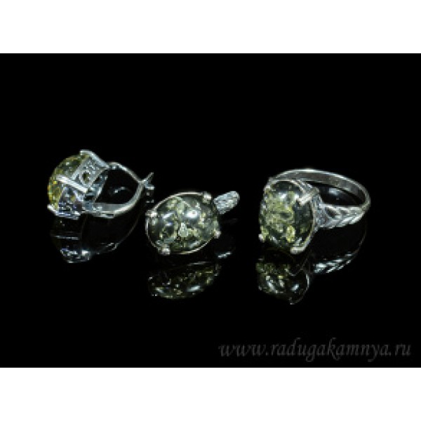 Набор с янтарём кольцо, серьги овал 12*16мм зеленый (иск.)