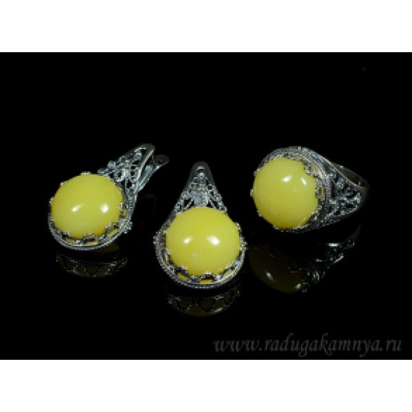 • Набор с янтарём кольцо, серьги 20*31мм молочный,  (иск.)