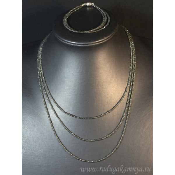 • Колье с браслетом из шпинели серой, 3 нити, шарик гр.2мм, 45см, 18см, 17гр.