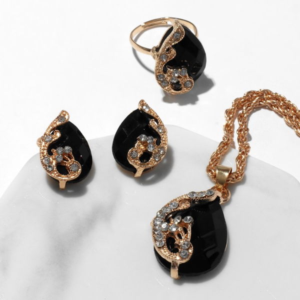 • Гарнитур 3 предмета: серьги, кулон, кольцо "Капли", цвет чёрно-белый, цвет золотистый