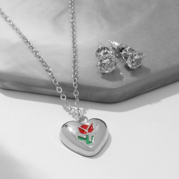 Комплект: серьги, кулон «Сердце» с цветком внутри, цветной, цвет серебристый, 45 см