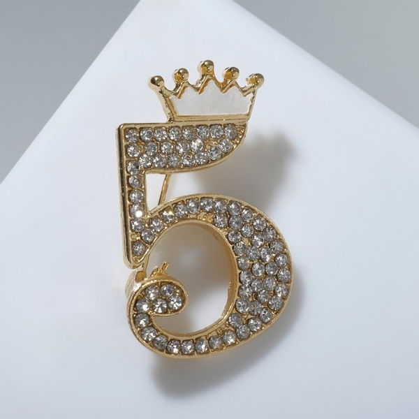 Брошь "Пятёрка" с короной, цвет белый, цвет золотистый