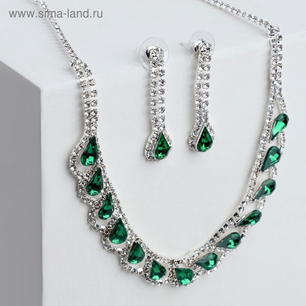 Комплект: серьги, колье "Листопад" капли, цвет зеленый, цвет серебристый