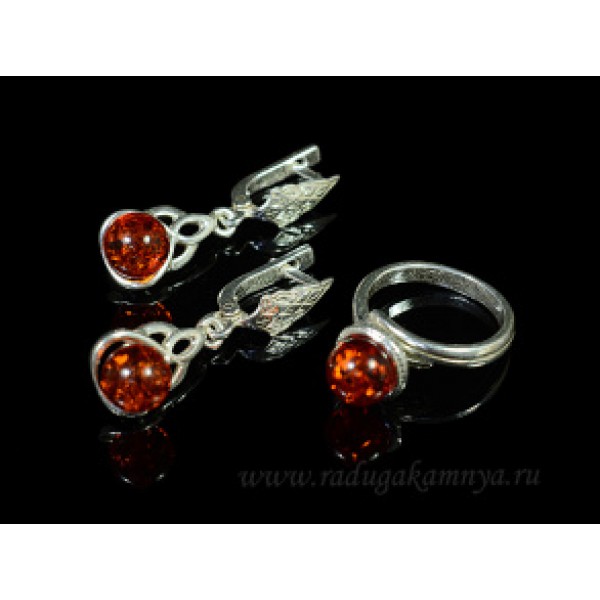 Комплект с янтарём в посеребрении кольцо, серьги шарик 8мм коньячный. (иск.)