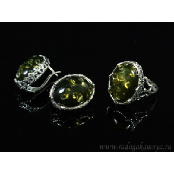 Набор с янтарём кольцо, серьги овал 18*23мм зеленый, 8,1гр. (иск.)