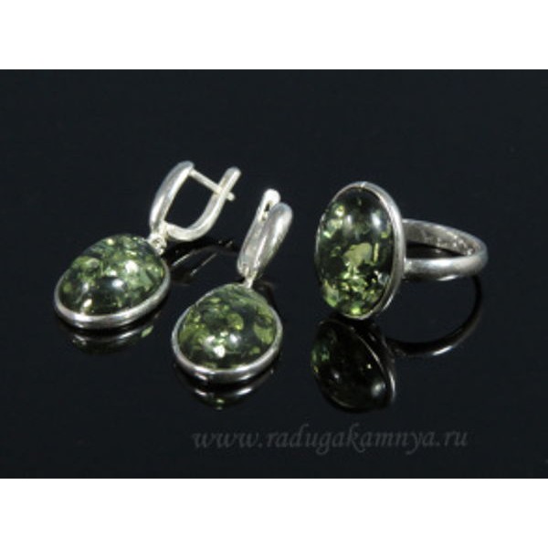 Комплект с янтарём в посеребрении кольцо, серьги овал 15*20мм зеленый (иск.)