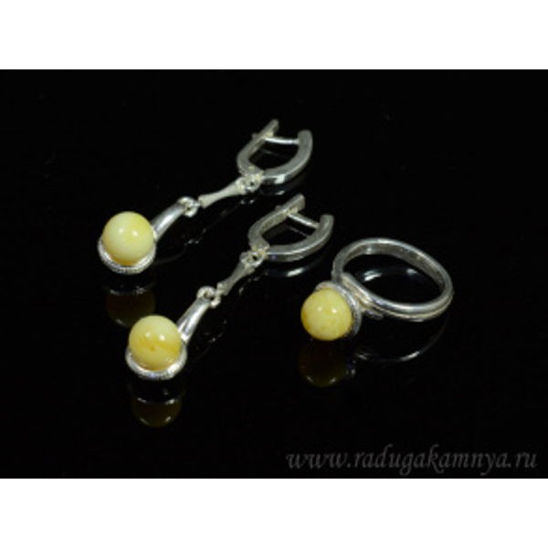 Комплект с янтарём в посеребрении кольцо, серьги шарик 8мм молочный, 3см. (иск.)