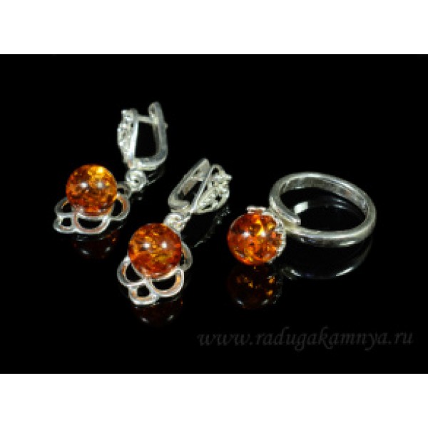 Комплект с янтарём в посеребрении кольцо, серьги шарик 9мм коньячный. (иск.)