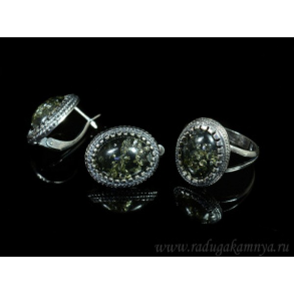Набор с янтарём кольцо, серьги овал 17*20мм зеленый (иск.)