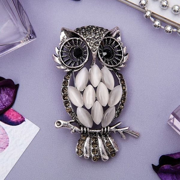 Брошь "Сова", цвет зелёно-белый, цвет серебристый (стразы, эмаль)